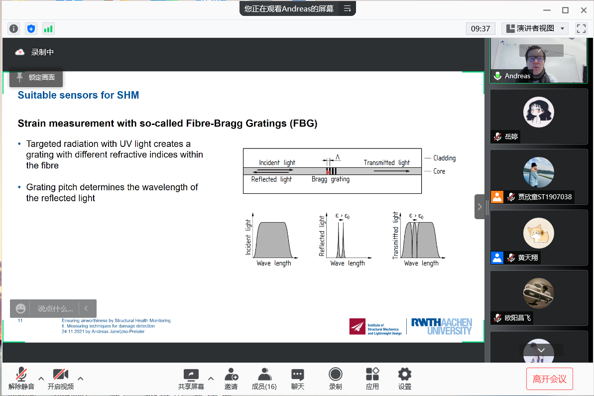 11月24日下午,“民用航空讲坛”第十九期讲座成功举行,讲座采用了线上线下相结合的形式,线下会场设置在将军路校区A08号楼312智慧教室。本次讲座由民航学院黄天翔老师主持。德国亚琛工业大学结构力学和轻量化设计研究所(SLA)工程系主任Andreas Janetzko-Preisler受邀为师生带来了一场围绕结构健康监测展开的线上讲座。
