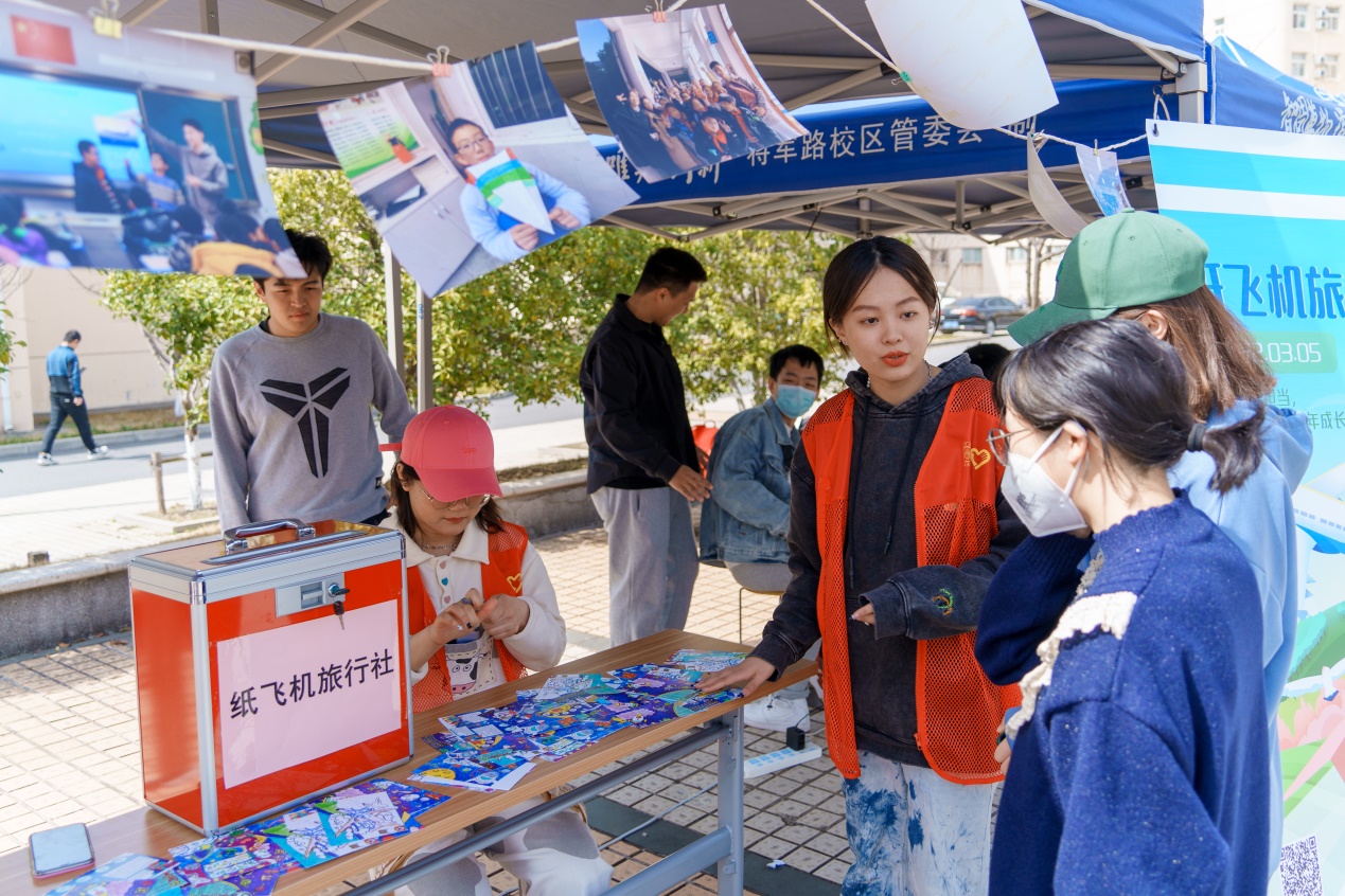 “光盲之路”展位为每位前来的同学送上一张手绘的盲人相关文创;“小红花”留声机前,是一个个大哥哥大姐姐录下叮咛与寄语;“情系溧阳”团队整理了100道有关雷锋同志生平及事迹的题目;“民航说”展位准备了“纸飞机旅行社”的门票,正面是一张张写满祝福的明信片,反面是孩子们创作的航空航天民航元素的图画。
