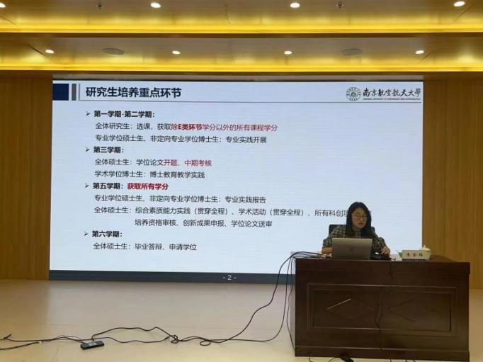 随后,吴薇薇发表了总结讲话。“导师是研究生培养的第一责任人”,提醒研究生们应高度认识导学关系的重要性,加强和导师的良性互动,做到保持沟通、迅速落实、及时反馈,建立和谐友好的导学关系。她强调,研究生在培养个人科研能力的同时应注意加强团队合作,充分发挥团队力量。最后,吴薇薇希望民航青年能够以民航十四五规划为指引,开拓创新,勇攀学术高峰,并表达了对新一届民航学院研究生的衷心祝愿和美好期望。最后,由研究生教务教学秘书宋晓静为新生讲解了研究生教学教务的相关事项,就选课开课、培养方案、课程重修、学位学籍等方面进行介绍。