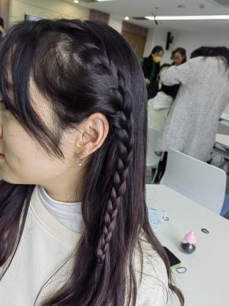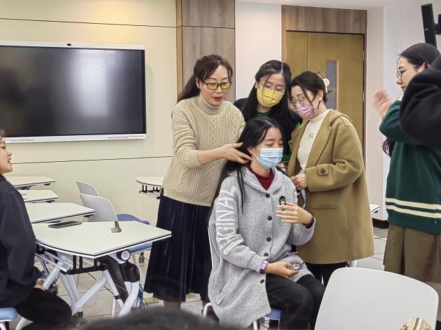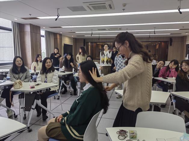 活动分为教学观摩和指导实践两部分。首先是嘉宾教学环节,张华为在场研究生讲解辫子扎法的创意发式,按辫子的紧实程度、缠绕方式、美观度等方面主要分为“2+1”、“2+2”、“3+1”、“3+2”四种方式,经过或团、或勾、或绕、或编的编织手法,松散的长发就变成了公主辫、麻花辫、甜美爱心辫、鱼骨辫……平平无奇的初始发型被老师改造得各具特色。随后,在张华的悉心指导下,学员们进入了实践环节。女生们使出浑身解数,在心跳与手指的低语中屏息凝神,在发绳与发丝的对话中巧生形状,经过耐心地交流与练习,女生们的编发技巧不断精进,大有青出于蓝而胜于蓝之势,获得张华连连赞扬。