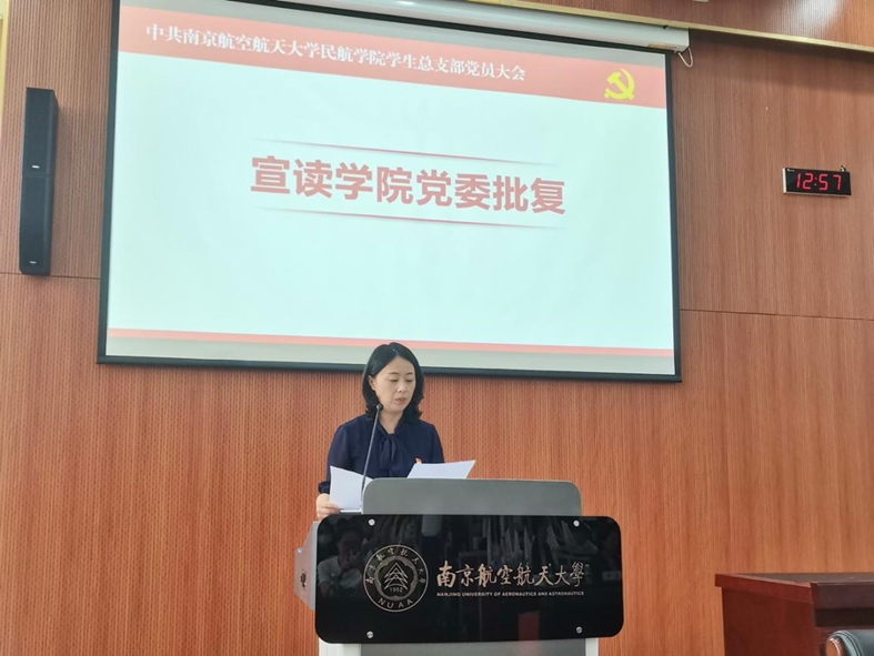 大会在庄严的国歌声中拉开序幕。会上,李君宣读了《中共南京航空航天大学民航学院委员会关于同意中共南京航空航天大学民航学院学生总支部委员会换届选举请示的批复》。