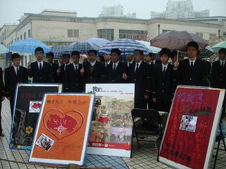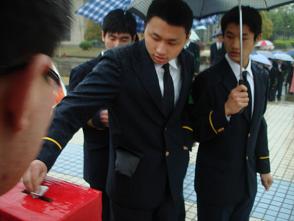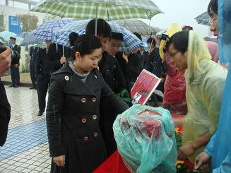 中午11点30分,天空下起了大雨,将军路校区和御道街校区爱心募捐活动同时开始。在将军路校区,民航/飞行学院08级飞行学员组成礼仪队,穿着整齐的制服,笔直地排列在樱花广场两侧,抗争救灾音乐回响在广场上空,现场气氛庄严而肃穆。16名青海籍学子穿着雨衣整齐地站在募捐箱旁,向每一位前来捐款的人发放赠送绿丝带,并鞠躬致谢。