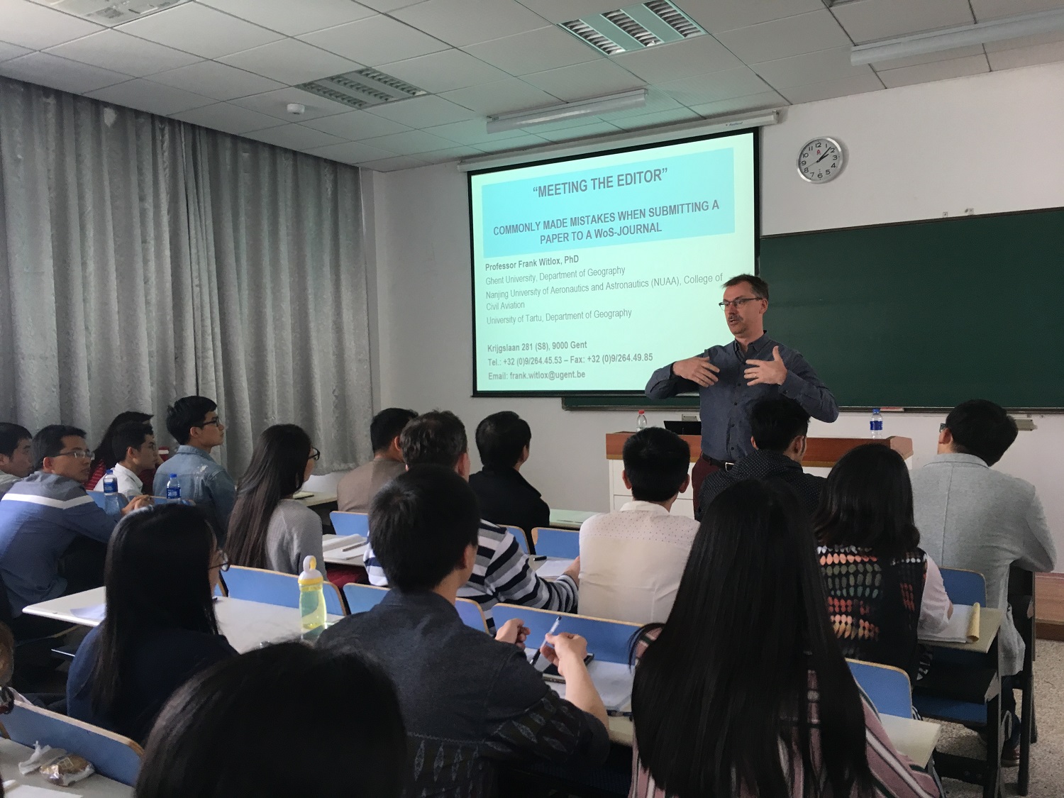 2017年4月17日下午2点,比利时根特大学Frank Witlox教授应民航学院邀请在将军路校区2号楼2105教室作了题为“英语学术论文写作:中国学者如何避免撰写及投稿误区”的学术讲座。讲座由副院长葛红娟教授主持。学院师生共计100余人参加了此次讲座。