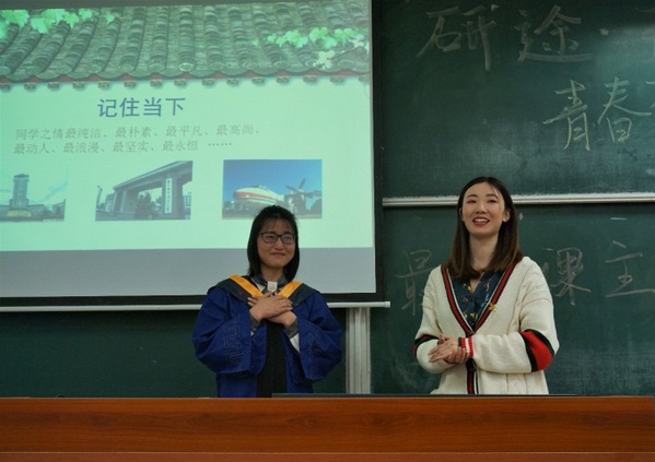 4月2日上午,91AV 2019届硕士毕业生于6102教室开展了“研途•玖别,青春不散场”最后一课主题班会,为踏入新征程的学生们送去最殷切的期望和最美好的祝福。全体毕业生在欢声笑语中一起度过了温馨美好的最后一课。