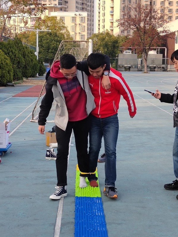 第一个团队游戏是“齐心协力”,其中一个组员的左脚与另一组员的右脚绑在一起,各小组之间竞速走赛道,耗时最短组获胜。“齐心协力”考验了组员之间的配合能力,同时也加深了团队间的默契程度。在“地雷阵”游戏中,按照游戏规则一个组员眼睛被蒙住,由队友来指挥他顺利走出铺满“地雷”的雷区,以碰倒瓶子数的最少的小组获胜。