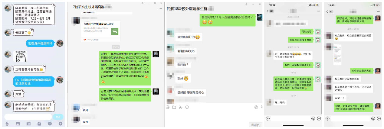 疫情期间,校园实施封闭管理,管控措施一次次升级,但隔离的空间并未阻断温暖的传递。学院通过线上联络、走访慰问等多渠道加强与学生的联系,关怀校内外隔离学生情况。第一时间为外专楼隔离学生送上生活用品,倾听同学们的需求。辅导员们每天通过微信群密切关注学生动态及身心健康,对院内河南籍学生更是点对点联络沟通、询问是否需要学校提供帮助。