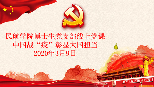 为响应学校和学院党委号召,做好疫情防控期间的党员思想教育和价值引领工作,3月9日上午,民航学院博士生第一和第二党支部联合开展了以“中国战‘疫’彰显大国担当”为主题的线上党课。本次党课由三个环节组成:博士生第二党支部书记郭家琛主讲《中国战“疫”彰显大国担当》、博士生第一党支部书记桑益芹点评讲解,以及党员互动交流。民航学院34名博士生党员参与本次活动。