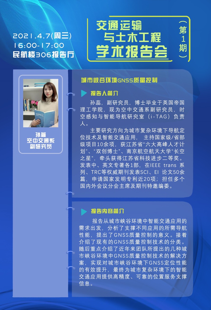 孙蕊,副研究员,博士毕业于英国帝国理工学院,现为空中交通系副研究员,时空感知与智能导航研究室(i-TAG)负责人,主要研究方向为城市复杂环境下导航定位技术及智能交通应用,主持国家级/省部级项目10余项,获江苏省“六大高峰人才计划”、“双创博士”、南京航空航天大学“长空之星”,牵头获得江苏省科技进步二等奖。发表中、英文专著各1部,在IEEE trans 系列、TRC等权威期刊发表SCI、EI 论文50余篇,申请国家发明专利近20项;担任多个国内外会议分会主席及期刊特邀编委。