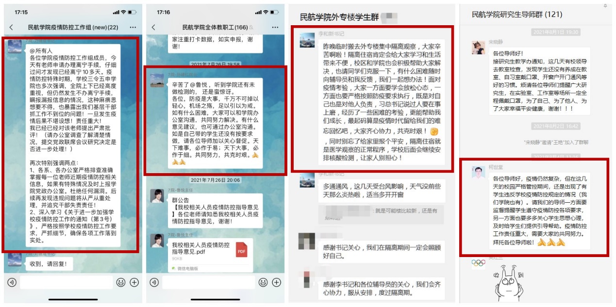 疫情期间,校园实施封闭管理,管控措施一次次升级,但隔离的空间并未阻断温暖的传递。学院通过线上联络、走访慰问等多渠道加强与学生的联系,关怀校内外隔离学生情况。第一时间为外专楼隔离学生送上生活用品,倾听同学们的需求。辅导员们每天通过微信群密切关注学生动态及身心健康,对院内河南籍学生更是点对点联络沟通、询问是否需要学校提供帮助。