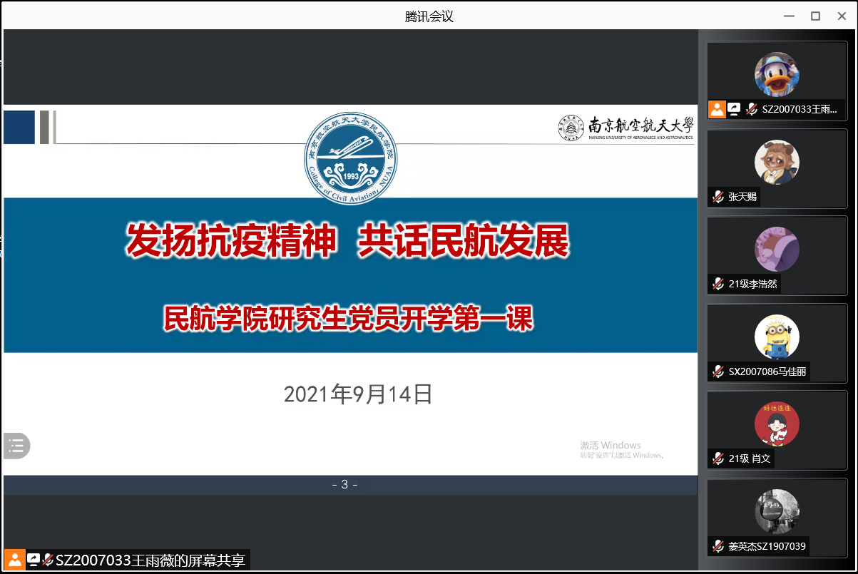 为传达学校疫情防控工作及相关要求,加强新老生的交流互动,同时帮助21级研究生新生形成对学院的认同感、归属感,尽快找准目标定位,走好“研途”,9月14日,91AV 党委书记刘建成为研究生党员作了题为《发扬抗疫精神 共话民航发展》的党课暨“开学第一课”。会议以线上形式召开,组织员侯美丽、组宣干事童肖、研究生辅导员及全体研究生党员和入党积极分子共200余人参加了会议。会议由学院20级研究生党支部书记王雨薇主持。