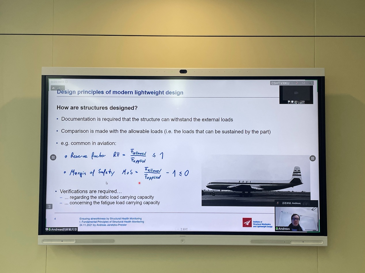 11月22日下午,“民用航空讲坛”第十七期讲座在将军路校区A08号楼312智慧教室成功举行。本次讲座由民航学院黄天翔老师主持。德国亚琛工业大学结构力学和轻量化设计研究所(SLA)工程系主任Andreas Janetzko-Preisler为师生带来了一场围绕结构健康监测展开的线上讲座。