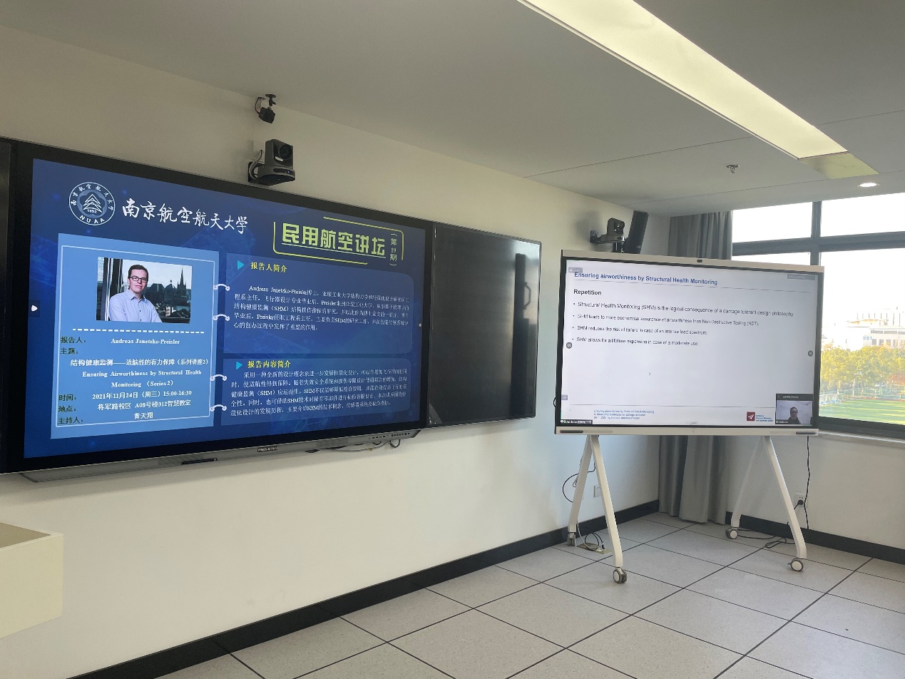 11月24日下午,“民用航空讲坛”第十九期讲座成功举行,讲座采用了线上线下相结合的形式,线下会场设置在将军路校区A08号楼312智慧教室。本次讲座由民航学院黄天翔老师主持。德国亚琛工业大学结构力学和轻量化设计研究所(SLA)工程系主任Andreas Janetzko-Preisler受邀为师生带来了一场围绕结构健康监测展开的线上讲座。