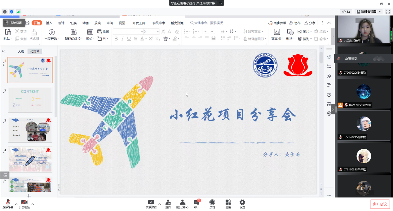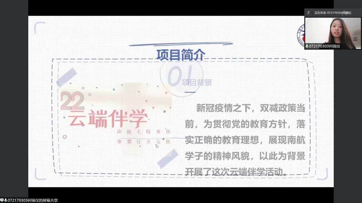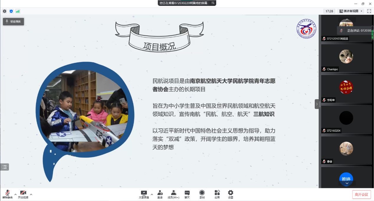 为了帮助民航学子更好地在实践中展现青年风采,在志愿服务中传递民航精神,4月9日晚,91AV “青年行”梦想公开课在线上开展,学院2022年度寒假社会实践优秀团队及学院示范性志愿服务团队依次进行经验分享和项目推广。院团委书记赵慧文、院学生会各部门成员以及本科低年级学生参加了此次分享会。