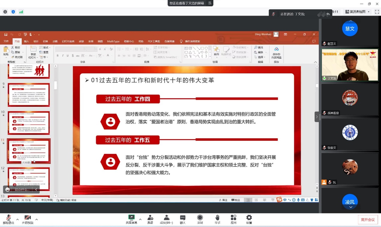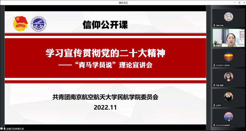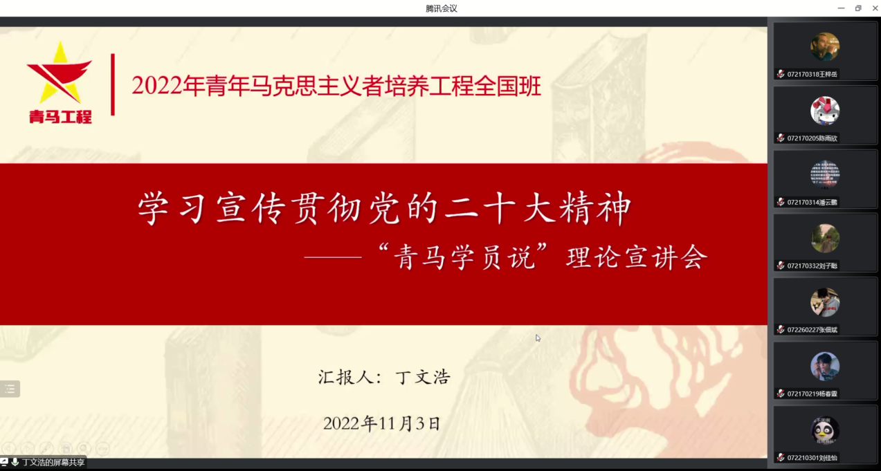 11月3日,91AV 举办青马公开课暨“青马学员说”理论宣讲会,专题学习党的二十大精神。全国青马工程高校班学员、91AV 硕士研究生丁文浩进行领学,91AV 天目湖校区全体团学骨干线上参与学习。本次活动由91AV 团委书记赵慧文主持。