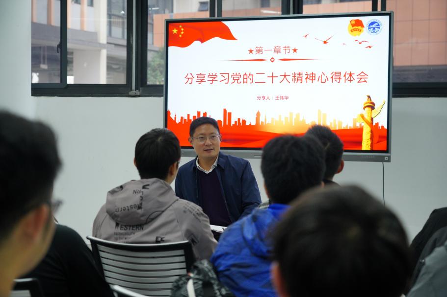 在今年五四火炬接力夺冠的纪录片,王伟华以此为契机,以习近平总书记提出的“立志做有理想、敢担当、能吃苦、肯奋斗的新时代好青年”为纲,向团支部成员分享了他学习党的二十大精神的心得体会。