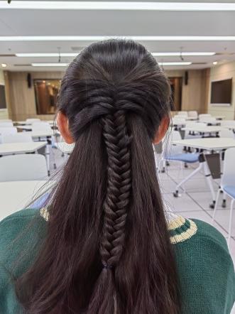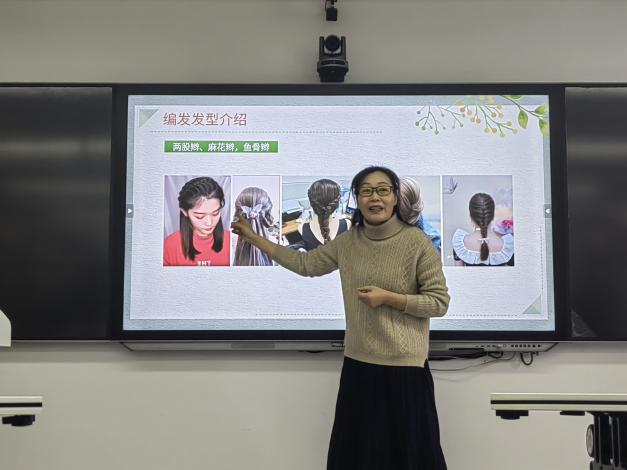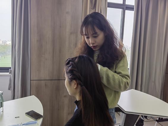 活动分为教学观摩和指导实践两部分。首先是嘉宾教学环节,张华为在场研究生讲解辫子扎法的创意发式,按辫子的紧实程度、缠绕方式、美观度等方面主要分为“2+1”、“2+2”、“3+1”、“3+2”四种方式,经过或团、或勾、或绕、或编的编织手法,松散的长发就变成了公主辫、麻花辫、甜美爱心辫、鱼骨辫……平平无奇的初始发型被老师改造得各具特色。随后,在张华的悉心指导下,学员们进入了实践环节。女生们使出浑身解数,在心跳与手指的低语中屏息凝神,在发绳与发丝的对话中巧生形状,经过耐心地交流与练习,女生们的编发技巧不断精进,大有青出于蓝而胜于蓝之势,获得张华连连赞扬。