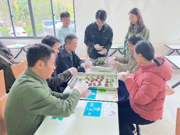 在青团制作环节,师生党员发挥动手能力,一起揉面、包馅,用掺有青汁的糯米皮,包裹进肉松、豆沙、咸蛋黄等馅料,制作出一个个清香扑鼻的绿色团子。在烹饪过程中,师生积极参与到传统文化知识问答环节,与会党员对中华传统节日的认同感不断增强。教职工党员的参与促进了学生支部与教工支部之间的联系与交流,进一步激励广大党员同志新时代新担当新作为,切实增强党支部的凝聚力与战斗力。
