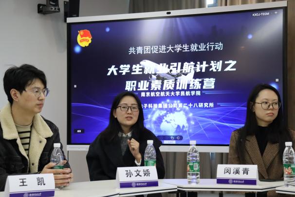 为进一步落实“共青团促进大学生就业行动”的工作要求,切实加强学生职业生涯规划引导,提升学生求职就业能力,3月21日,民航学院团委邀请电科莱斯、28所空中交通管理系统全国重点实验室和南京莱斯网信技术研究院的一线青年从业者来校开展“就业引航 ‘职’引未来”大学生职业素质训练营。民航学院团委书记赵慧文、本研辅导员代表及学生代表参加此次活动。